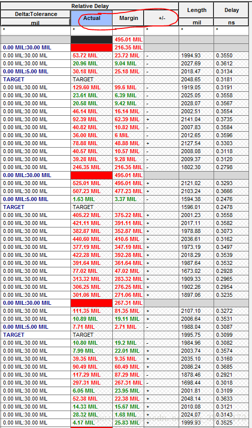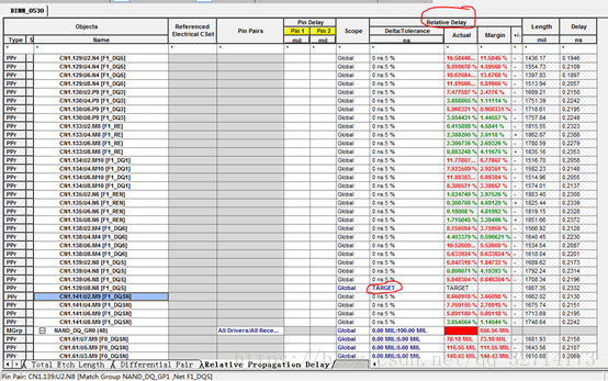 C、match group设置好之后,设置等长基准,这边以DQS为基准(选择其中一个即可),右键set as target。然后在其他单元格设置允许误差的范围,一般为0:100mil。然后后面红色的数据表示超出范围,绿色的数据表示在范围内。