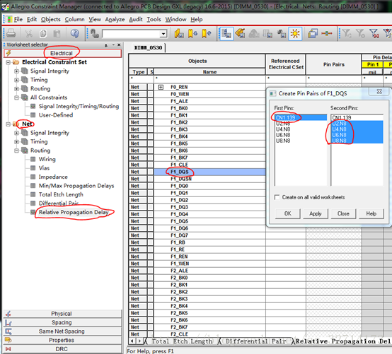 选择F1_DQS,右键creat-pin pair,则出现右边的选项框。First pin可以理解为源端,second可以理解为负载端,在T形网络中, 一个源端最多可以对应四个负载端,等长即从源端到每个负载端的长度一样。