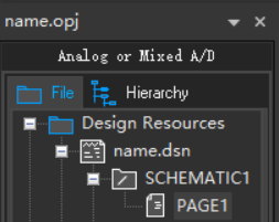 左侧 File >> Design Resources >> name.dsn >> SCHEMATIC1 >> PAGE1 打开 图纸