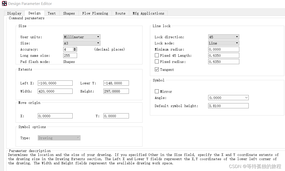 方法一:File->New;在Drawing Type中选择Board;在Drawing Name中填写PCB名字,在Brose...内选择PCB文件所在文件夹。 方法二:在Drawing Type中选择Board(wizard)注意:该方法没有办法进行板边的倒角。Setup->Design patrameters->Design和TextText是设置丝印大小,可以根据需求在Setup text sizes中自行添加。设置如下图所示。