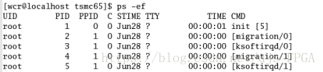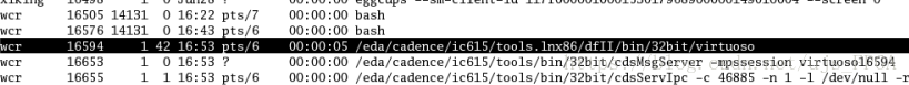 3、会将所有进程显示出来,这时我们要找到virtuoso这个进程。由于我的账户是wcr,这时千万不要找错了,有可能scf的virtuoso也在运行,千万不能将他的进程删掉。这时已经找到我cadence进程的地址PID。