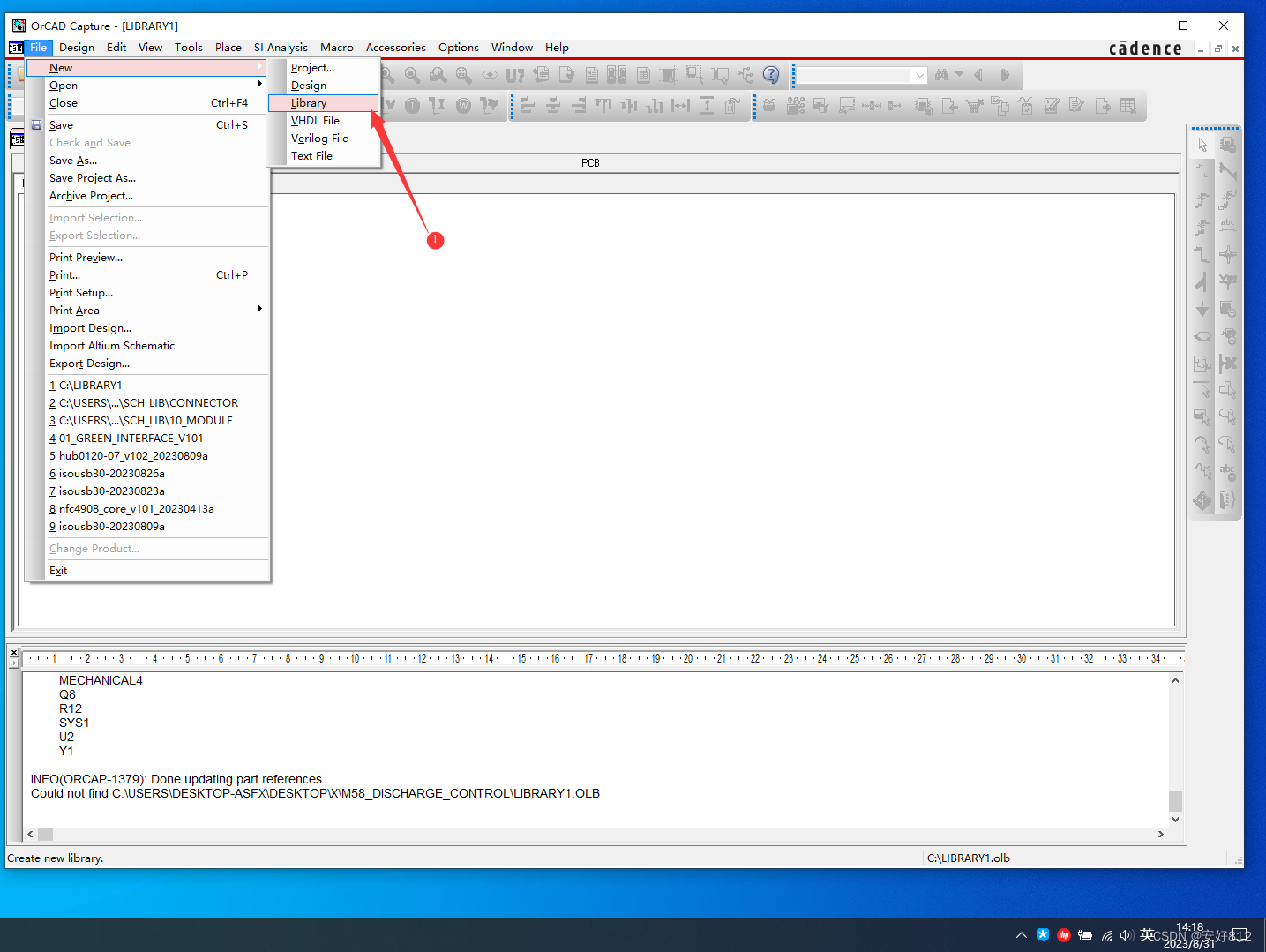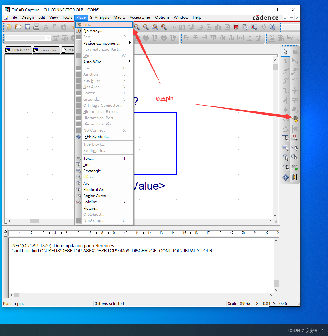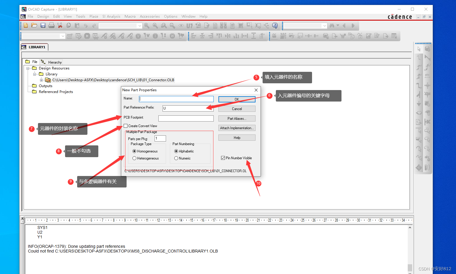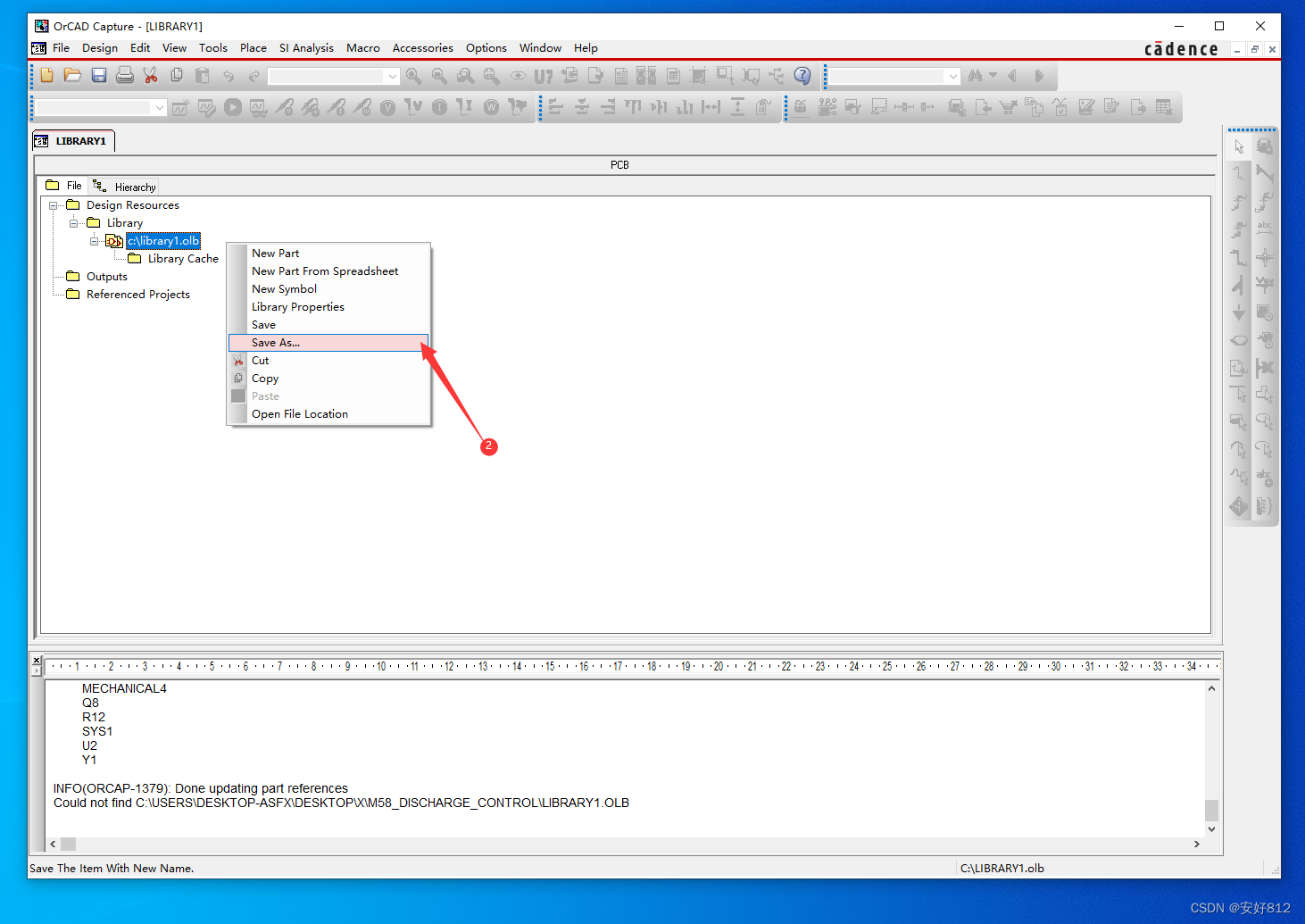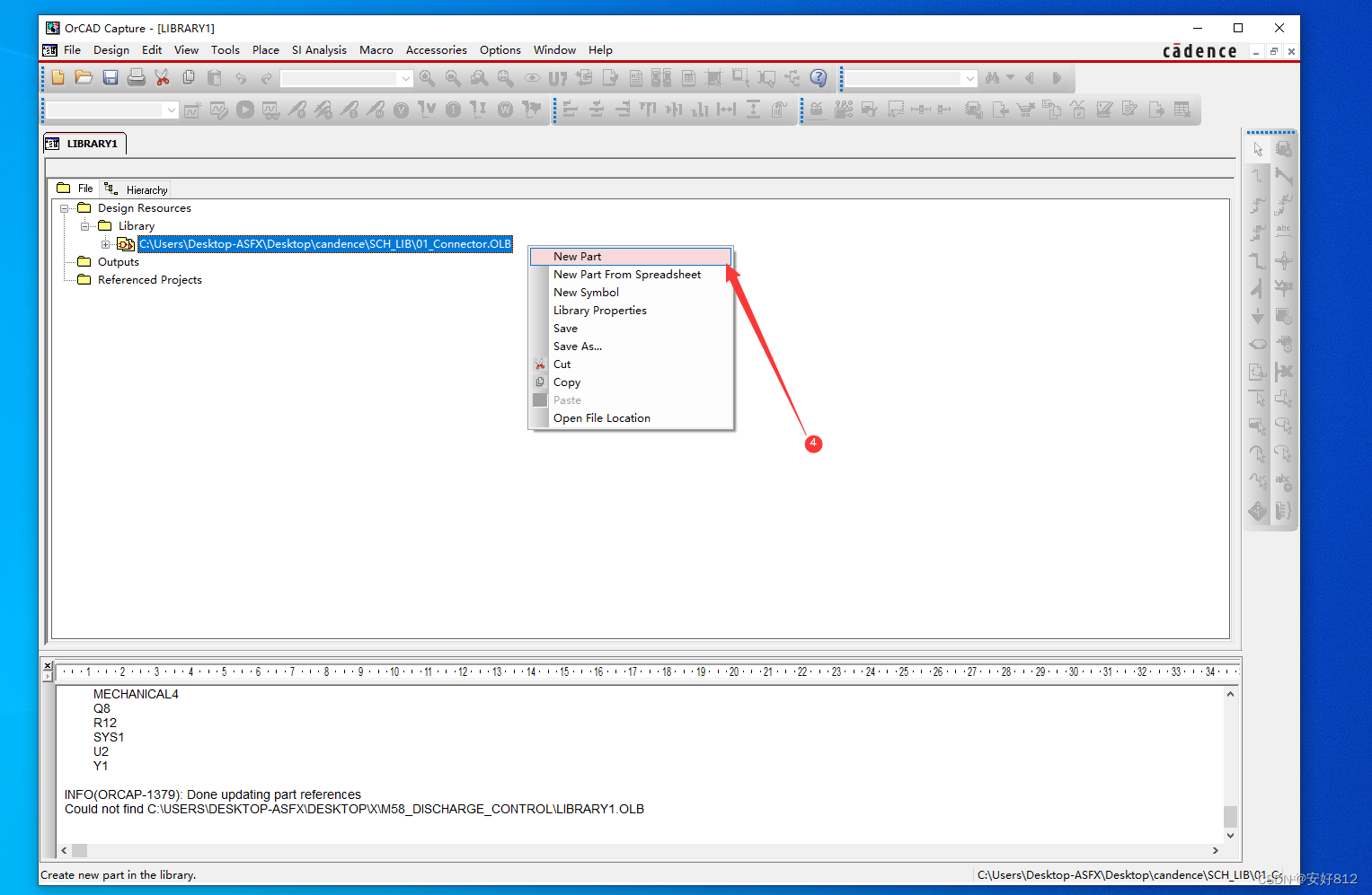 3、右击 “C:\Users\Desktop-ASFX\Desktop\candence\SCH_LIB\01_Connector.OLB”,选择 “New Part ”,如下图所示。