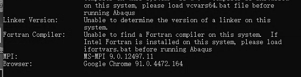 然鹅,在cmd运行 abaqus info=system 时,提示找不到Fortran编译器,详细如下图
