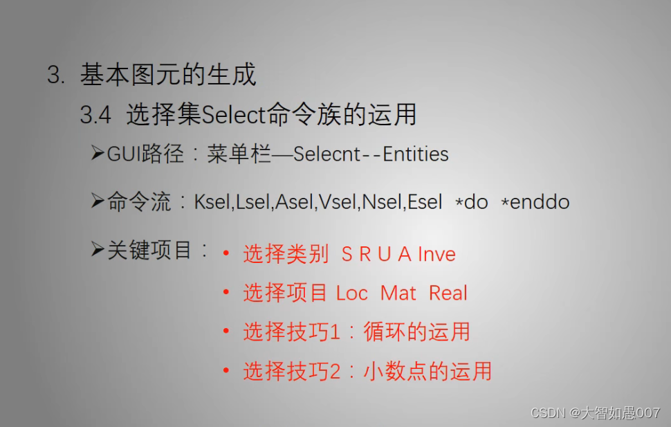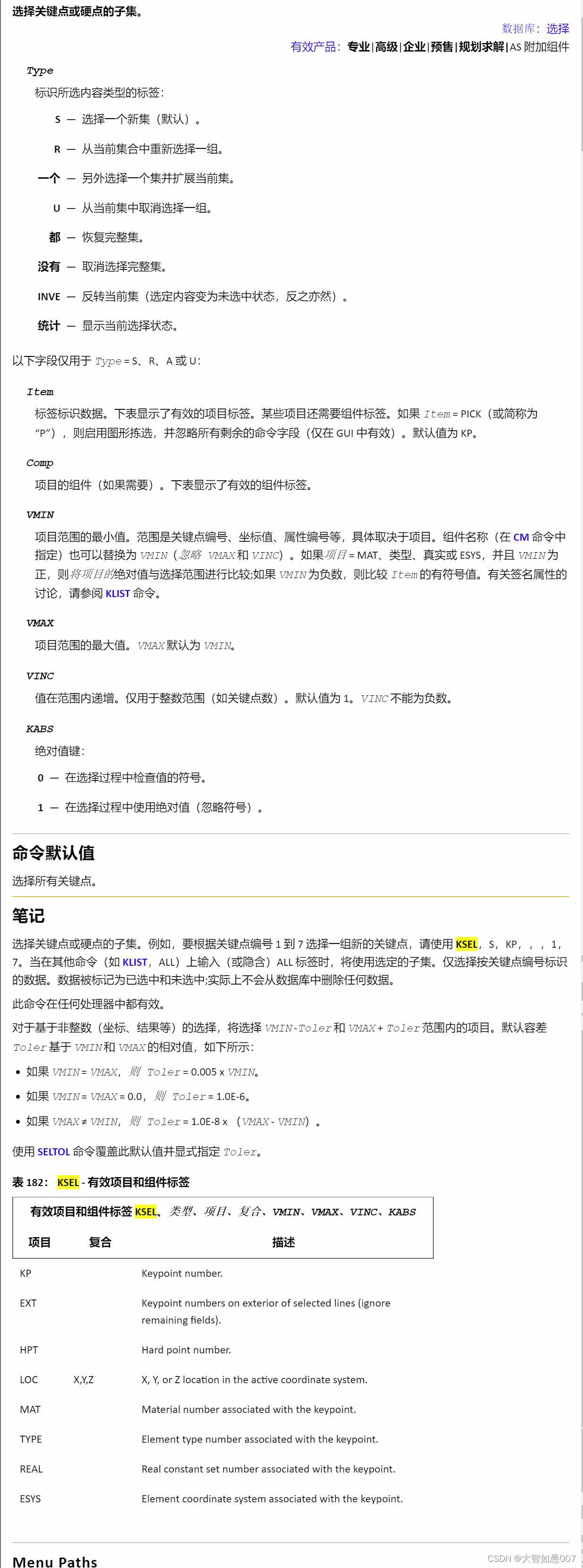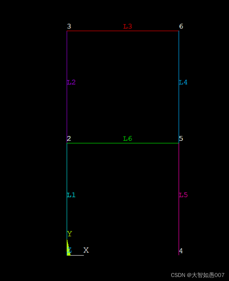 finish/clear/prep7k,1,0,0k,2,0,100k,3,0,200k,4,100,0k,5,100,100k,6,100,200l,1,2l,2,3l,3,6l,6,5l,5,4l,2,5 lsel,s,,,6 ! s选择一个新的集合 6表示之选择六号线段 lsel是线段的集成命令lsel,s,loc,y,0,200 ! loc 坐标