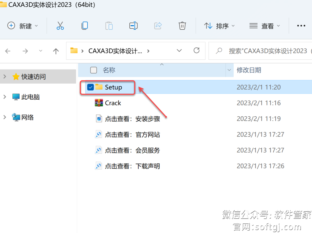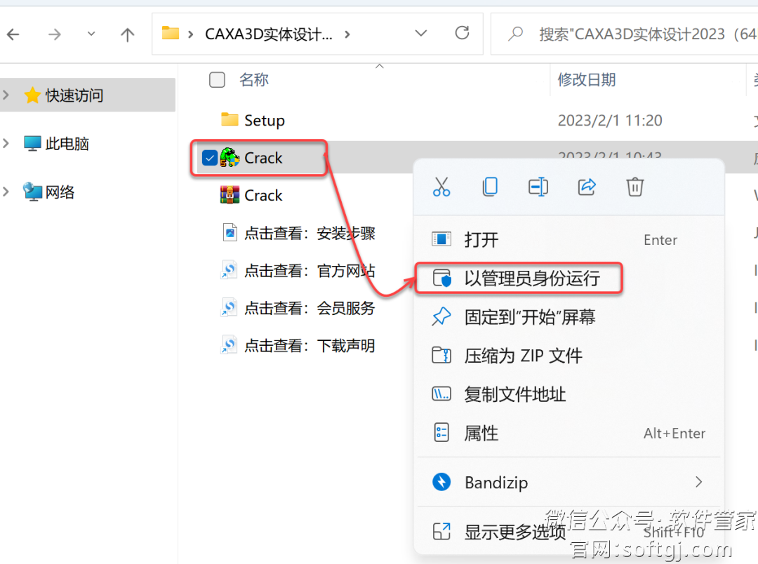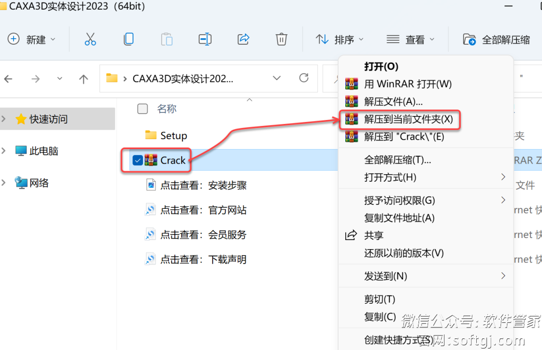 11.打开安装包解压后的【CAXA3D实体设计2023(64bit)】文件夹,鼠标右击【Crack】选择【解压到当前文件夹】。