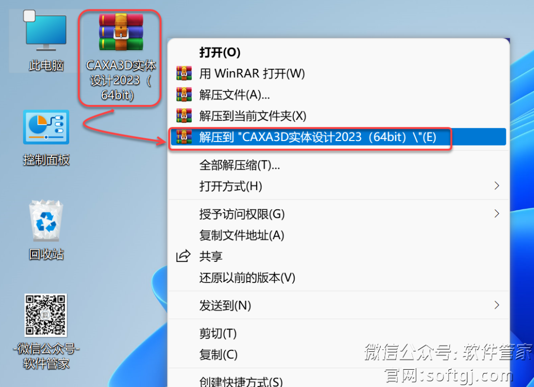 1.鼠标右击【CAXA3D实体设计2023(64bit)】压缩包(win11及以上系统需先点击“显示更多选项”)选择【解压到 CAXA3D实体设计2023(64bit)】。