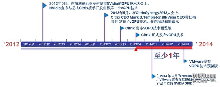 在成功研发出GPU透传技术之后,Citrix再接再厉,和 NVidia 公司合作继续开发了性价比更高,也更具有划时代意义的vGPU虚拟GPU卡技术,完全填补了图形工作站和普通工作站之间的空白。在Citrix公司去年推出vGPU技术后至今为止已经有无数个设计型客户体验了vGPU的神奇之处并对vGPU赞不绝口。VMware肯定也不会放过这个商机,不过很遗憾,时至今日还未见到View也没有提供正式版的vGPU技术。