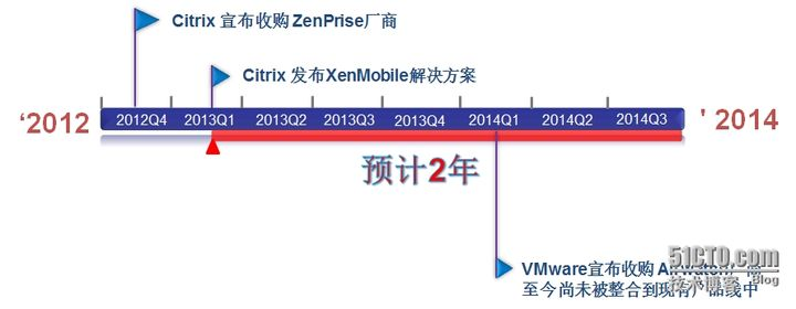 移动设备管理方案发布时间:Citrix在2012年收购ZenPrise,随机立即整合现有产品推出XenMobile解决方案,VMware2014年1月收购Airwatch后尚未整合;