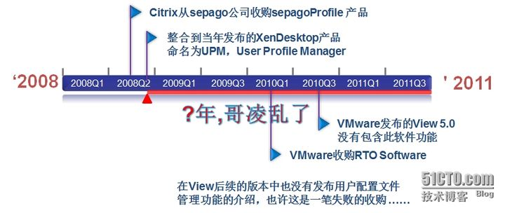 可以说没有用户配置文件管理技术,桌面虚拟化就失去了它耀眼的光芒。虚拟化技术真正实现了Windows、App和用户Data的分层管理,其中很重要的技术点就是帮助用户能从Windows操作系统中分离出用户配置文件并单独保存。Citrix在2008年收购sepagoProfile产品后几个月后就迅速整合到XenDesktop产品中。不过这一回VMware没有抄对,他们在一年半后也收购了类似的一个产品,可是时至今日也没有看到整合到View中,各种原因无人知晓,希望有知情人士能告诉博主出了什么事情。。。。