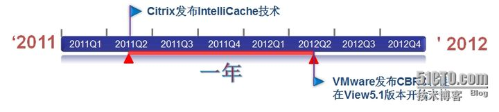 为了进一步降低桌面虚拟化的投入成本,Citrix在2011年5月发布了IntelliCache技术。在过去,VDI项目都是使用共享存储,服务器的本地存储设备被闲置,是一个不小的浪费,IntelliCache技术可以把 虚拟机 的主镜像文件传送到服务器的硬盘上,使虚拟机对存储的读写由原来的共享存储,转向对服务器本地存储设备的读写,既节省了共享存储的投入成本,又有效利用了现有的投资,是一个双赢的结果。VMware在获知此技术后,在View 5.1版也发布了类似的技术,称之为CBRC(Content Based Read Cache)。