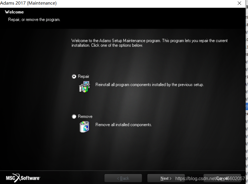 具体描述下问题:卸载了Adams2013之后重装2017版,但重装过程中, 安装文件 启动后明显跳过了很多教程上的步骤,直接弹出了一个窗口,示意我选择 repair 或者 remove 选项,大概如下图(这个弹窗是我重装成功后在开始菜单里面点击Adams卸载选项跳出来的,用这个图代替下当时的实际弹窗,当时重装实际情况下这一环节的弹窗背景是蓝色的);我在出现这弹窗时选了 repair ,其后直接出现 finish 弹窗,跟安装教程的步骤不一样。安装之后点击桌面上的Adams图标毫无反应,根据网上教程在 imtools 里面设置、重启也没用。