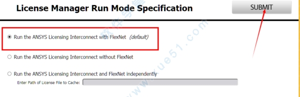 20、找到列表"Advanced Options- Specify License Manager Run Mode".中,勾选的是第一项Run the ANSYS Licensing Interconnect with FlexNet (default),然后点击右上角SUBMIT.