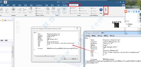 26、重新运行ANSYS 19.0 SCDM,点击Monentum >about>Enter new license,打开破解文件Dynamics_for_ANSYS_19.0_SCDM下的algoryx_license.txt,将里面的内容全部复制到框中,点击ok
