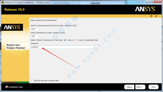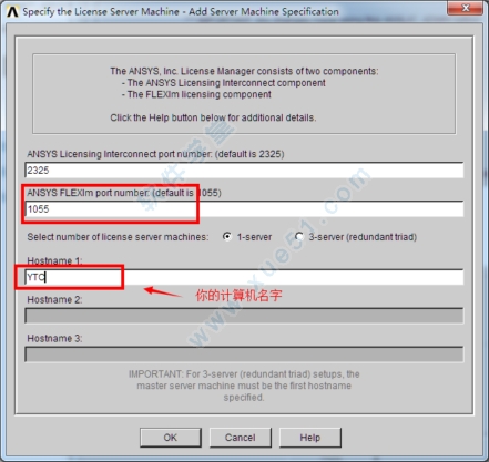 18、保证ANSYS FLEXlm port numbe为1055,下面host name1填入你的计算机名字,点击ok