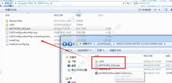 32、将ANSYS.ICEPAK.NETEX-G.V19.0.WIN64-SSQ文件下v190文件夹和ARTWORK_SSQ.dat拷贝到C:\Program Files\ANSYS Inc\目录下