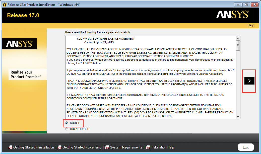 - 步骤2:选择选项I AGREE,选择右侧的箭头,如下图所示。