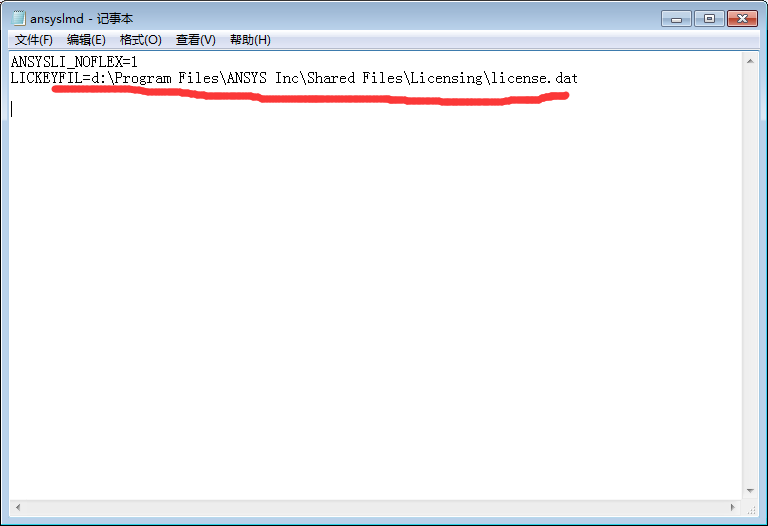 - 修改ansyslmd.ini文件,如下图所示。将LICKEYFIL后的文件路径改成本机上的license放置路径。