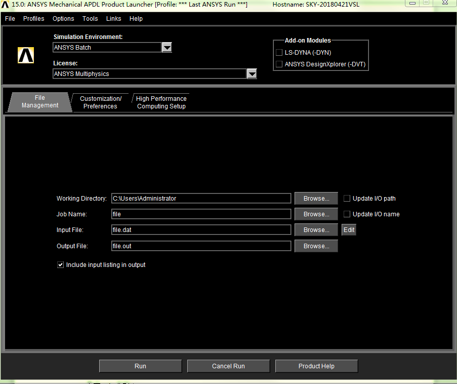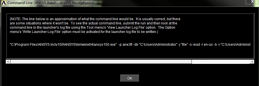 "C:\Program Files\ANSYS Inc\v150\ANSYS\bin\winx64\ansys150.exe" -p ane3fl -dir "C:\Users\Administrator" -j "file" -s read -l en-us -b -i "C:\Users\Administrator\file.dat" -o "C:\Users\Administrator\file.out"