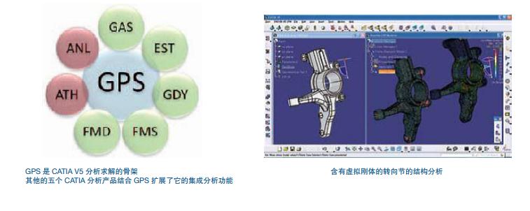 GPS 是 V5 分析产品包的核心。其他产品都能结合GPS 来提供附加的更高级的分析功能和适合分析专家的有限元建模功能。完整的 CATIA V5 分析包有创成式零部件结构分析(GPS)、创成式装配体结构分析(GAS)、创成式动力响应分析(GDY)、Elifini 结构分析(EST)、高级壳网格划分器(FMS)和高级实体网格划分器(FMD)。