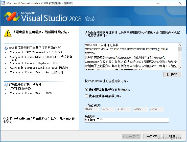 在起始页(图23)“接受许可条款”后,继续单击“下一步”。在这一界面中,左侧一栏列出了安装向导检测到的“已安装组件”和“将安装组件”,根据读者电脑的不同安装历史,这里的组件的排列顺序可能会有所不同,不用担心,直接继续下一步。