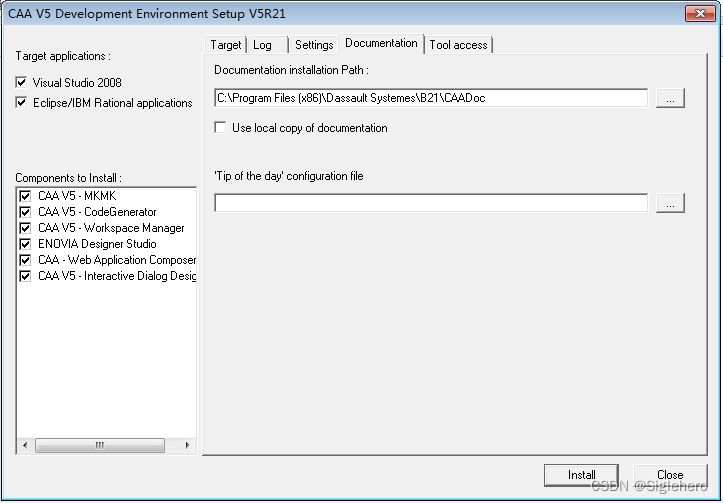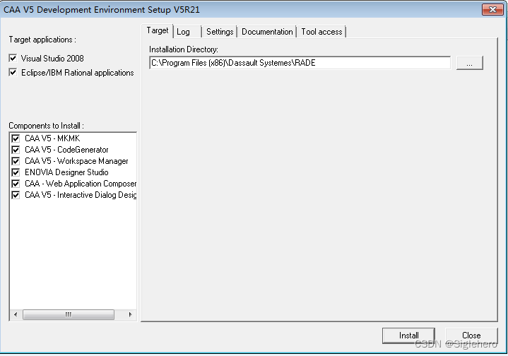 如图30所示,将界面左侧栏中的所有选项都勾选上;右侧信息栏中有两处需要注意:1)“Target”标签下安装路径默认为RADE的安装根目录,一般无需修改(图30);2)"Documentation"标签下,需将此处的安装路径设置为CATIA根目录下的CAADoc文件夹(图31)。