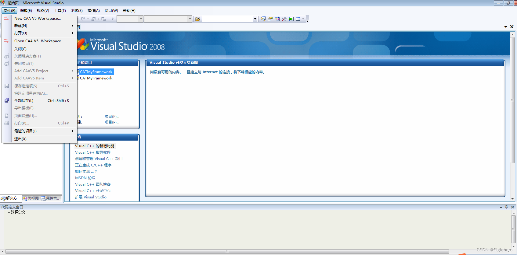此时再打开VS2008,如果你是第一次打开VS2008,会提示选择初始编程环境,这里选择C++即可。进入主界面后,关闭所有弹窗,展开菜单栏中“文件”的下拉菜单,若显示有“New CAA V5 Workspace...”等内容(图32),则表示RADE和VS2008链接成功。