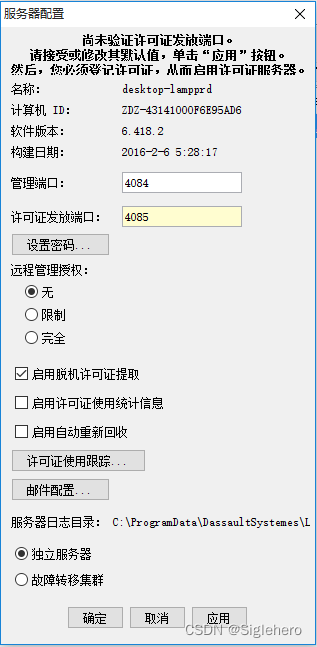 若之前已经关闭了《许可证管理工具》界面,则通过开始菜单再次打开它(图5),并打开之前创建的服务器的配置窗口(图7)。