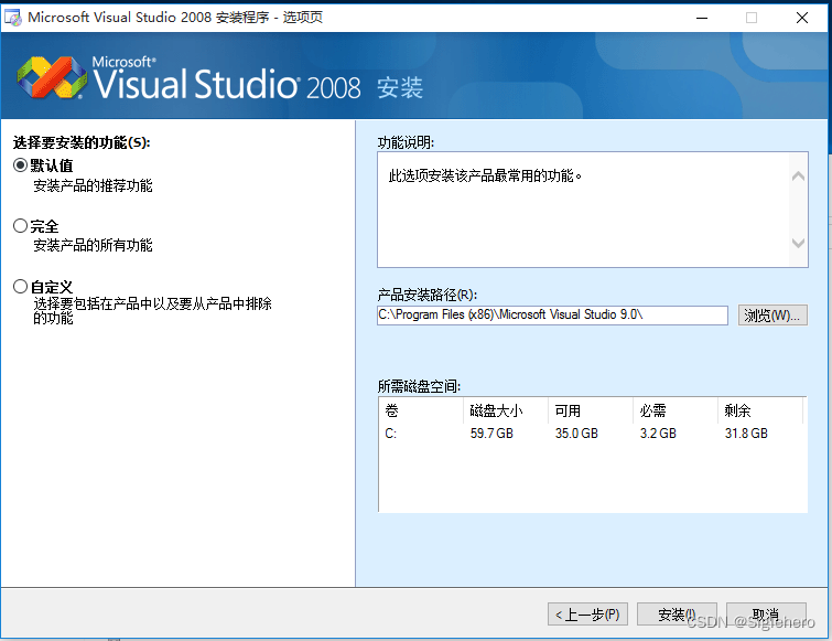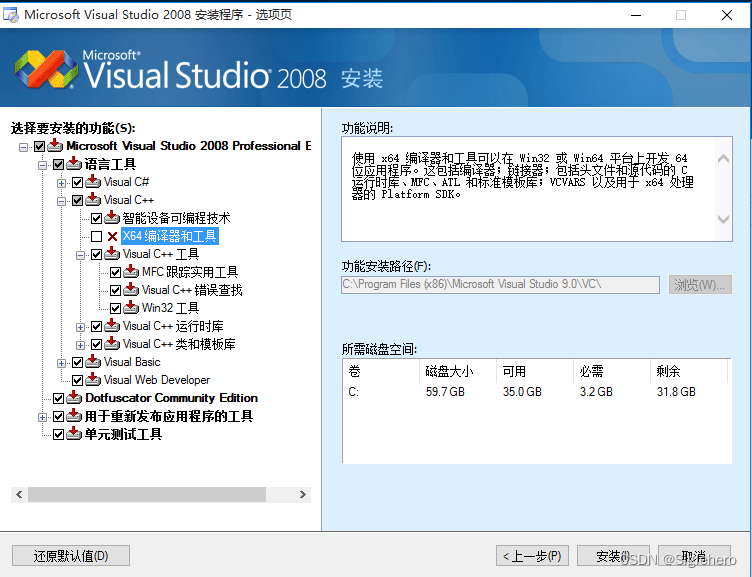 在选项页中(图24),读者可以根据自身的偏好设置软件的安装路径。如果你对于VS9各模块的作用并不了解的话,这里建议您在界面左侧一栏中选择“完全”安装。如果您对VS9足够熟悉且想节约硬盘空间,这里也可以选择“自定义”安装,并在之后的页面(图25)中勾选想要安装的模块。这里不能使用“默认值”安装,因为默认配置下不会安装X64编译器(图25),而这是二次开发所必需的。全部设置完成后,单击“安装”,并等待程序安装完成(图26)。