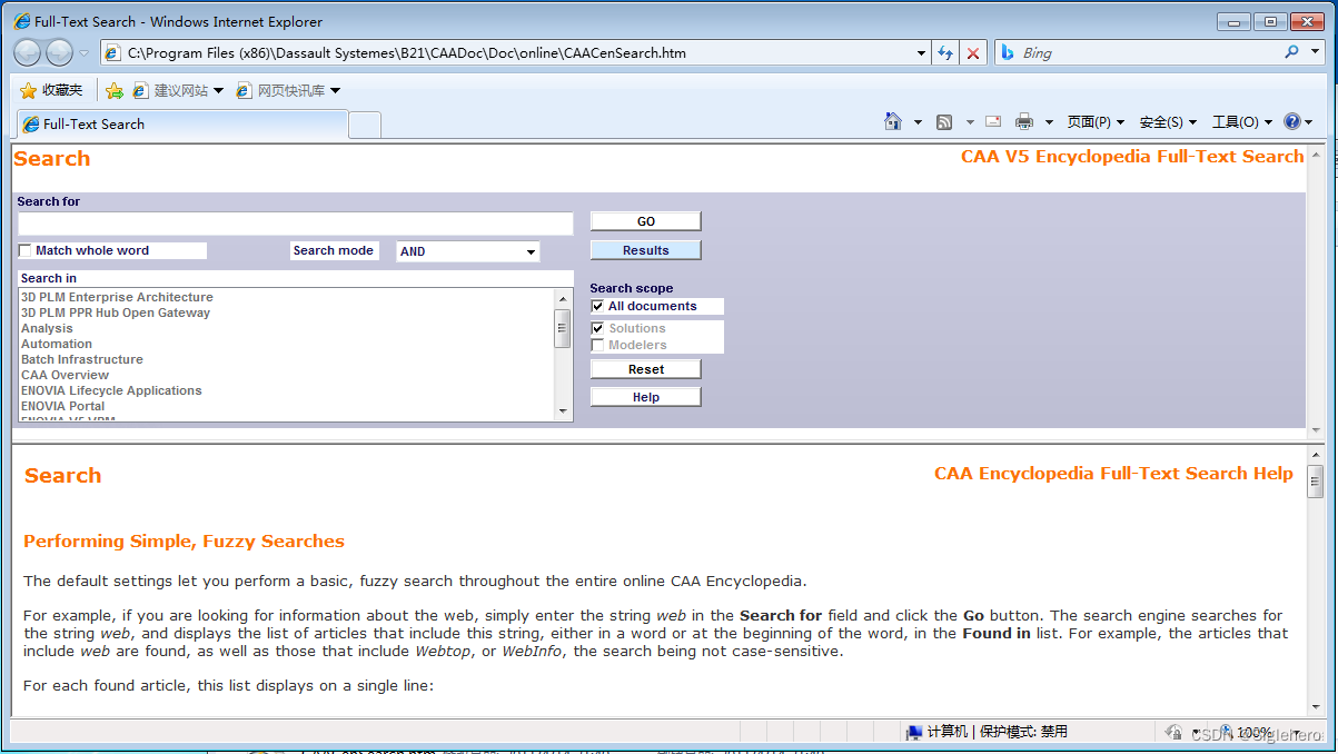 CATIA为帮助开发者能更好地熟悉CAA V5的开发技巧,编写了一整套完整的百科全书供开发者学习使用(百科全书的接近方式后文会介绍)。百科全书中有一个很重要的“搜索”功能需要Java插件配合IE浏览器才能使用(图34)。而高于Java6版本的Java是无法正常使用此搜索功能的。因此,笔者这里建议读者安装且只安装Java6,而不要去安装更高版本。