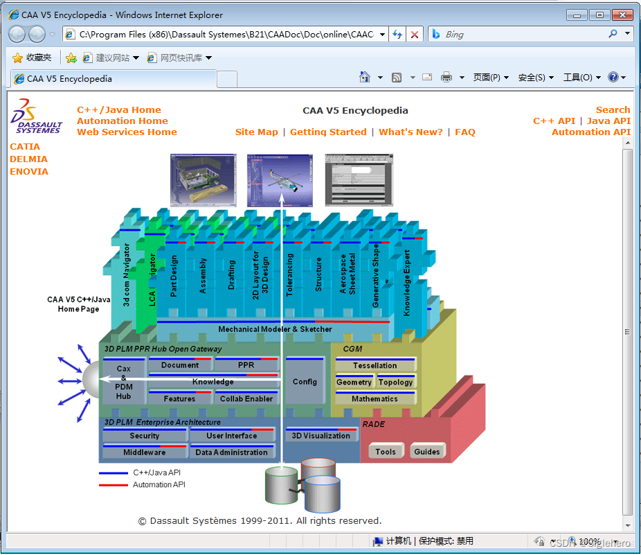 百科全书的入口在:CATIA根目录\CAADoc\Doc\online\CAACenV5Default.htm。双击即可在系统默认的浏览器中打开查看(图35)。其文章结构与使用方式在此不做介绍。