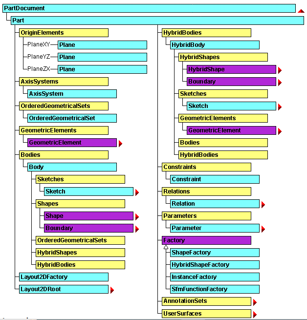 # 获取 Application 的 Documents 对象docs=catia.documents# 获取 CATIA 当前激活的 Part 文件partdoc1=catia.activedocument# 创建一个新的 Part 文件,注意 P 要大写partdoc2=docs.add('Part')# 打开 D 盘的 mypart.CATPart 文件,路径前加 r 是为了防止将路径中的\解析为转义字符partdoc3=docs.open(r'https://www.gofarlic.com\mypart.CATPart')# 获取装配里的 prd 部件对应的 Part 文件(仅限该部件为零件时)partdoc4=prd.ReferenceProduct.Parent获取到文件之后,通过 PartDocument.Part 即可获取到 Part 对象。 从帮助文档中可以查到, Bodies 隶属于 Part 下面,其 Object 的树状图如下: