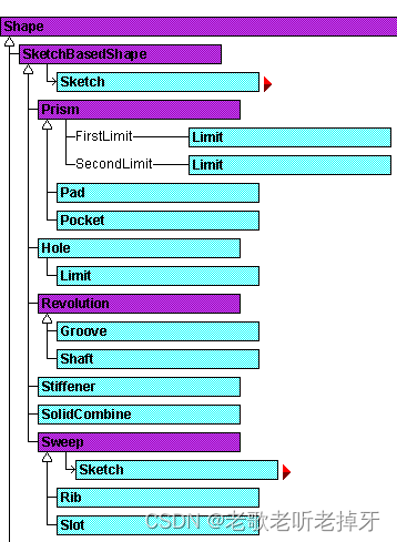 mycons=sketch.Constraints# 创建元素的参考ref1=part.CreateReferenceFromObject(myline)ref2=part.CreateReferenceFromObject(mycircle)# 创建相切约束,查阅帮助文档可知,相切: catCstTypeTangency 的枚举值为 4tan_con=mycons.AddBiEltCst(4,ref1,ref2)实体的生成(凸台、凹槽等)、修饰(倒角、拔模等)、变换(平移、旋转等),以及几何体间的布尔运算这些实体特征, 统称为 Shape,它可以通过 Part 下的ShapeFactory 对象的 Add 方法进行添加。并且, 对于每个具体的 Shape 特征, 我们可以通过该 Shape 的子对象或属性进行相关参数的进一步设置。例如,下图为帮助文档中, Pad(凸台)对象的子对象。
