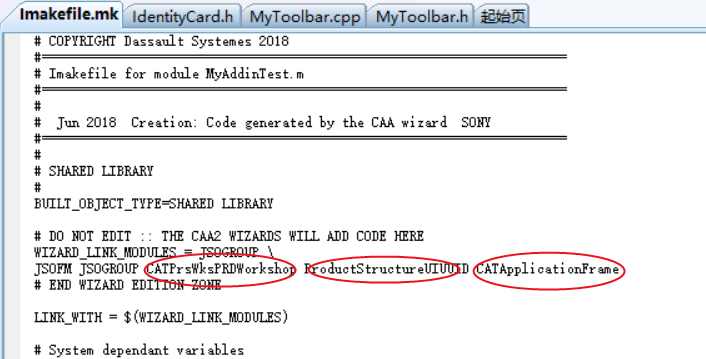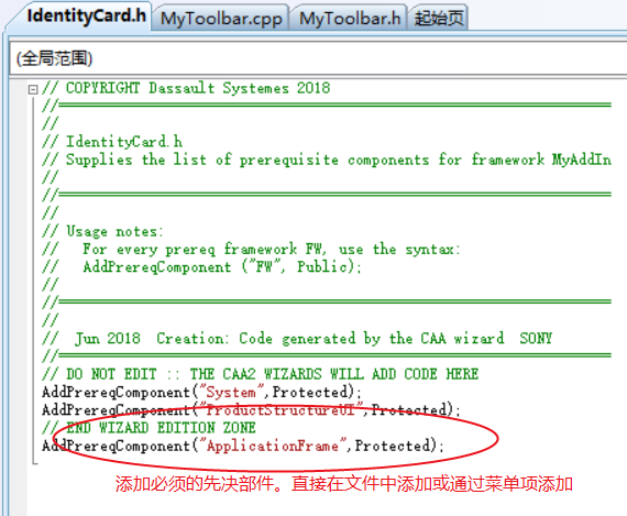(6)修改需要添加的先决部件Framework。直接在文件IdentityCard.h中添加或通过菜单CAA5 Workspace->Define