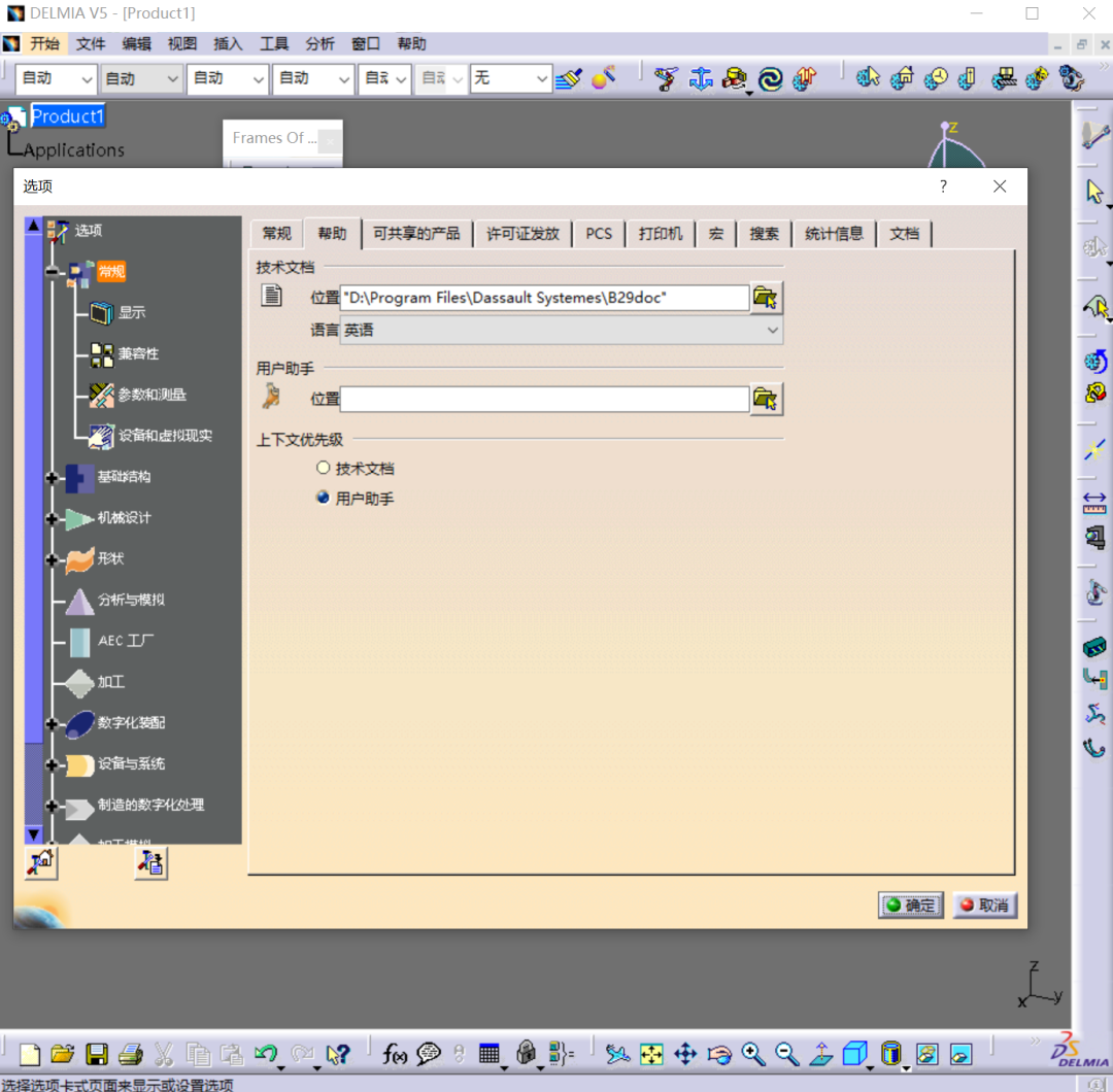 3、打开“DELMIA V5-6R2019”软件,进入工具中,点击“选项”,接着点击树形图下的“常规”,最后点“帮助”,如图所示,