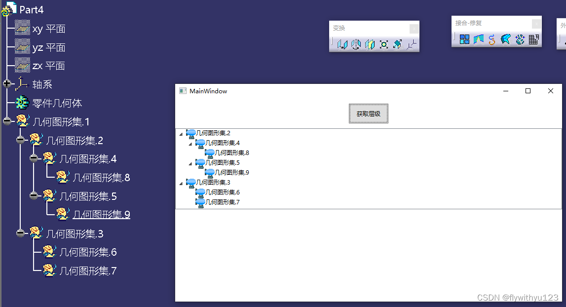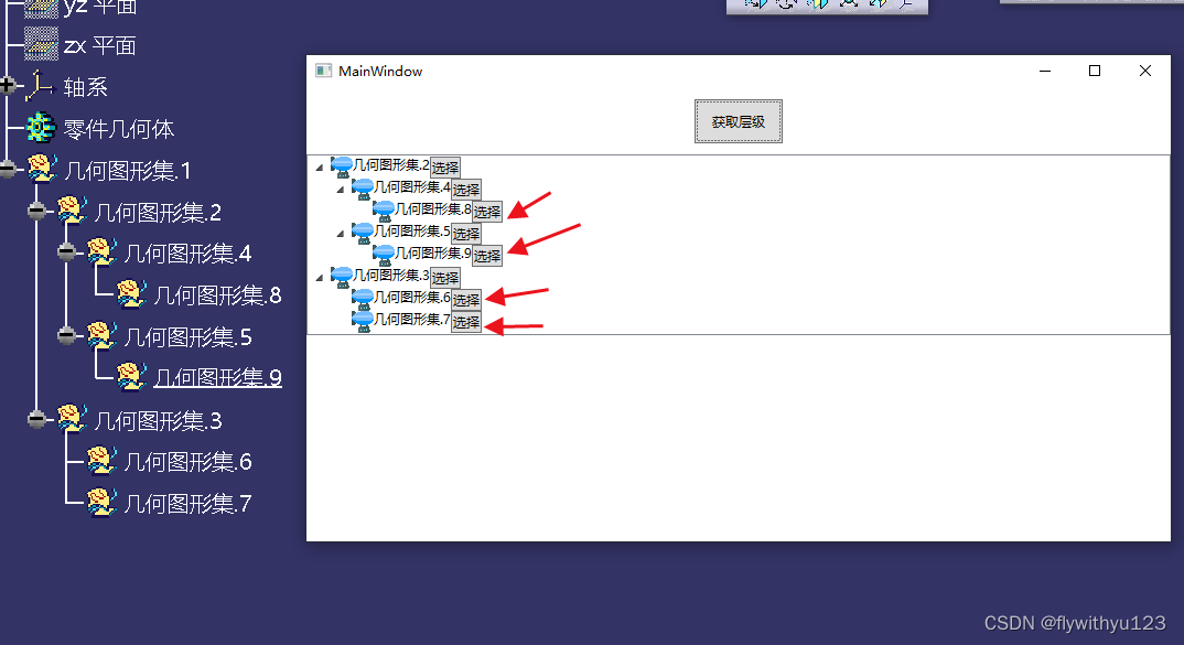 var refCurve = CatiaHelper.SelectionObject<HybridBody>(catApp); ///存放层级数据 List<TreeNode> list1 = new List<TreeNode>(); //遍历,通过递归的方法寻找到所有的层级。通过数据类中Children存放子集 if (refCurve.HybridBodies.Count > 0) { foreach (HybridBody index in refCurve.HybridBodies) { TreeNode tree1 = new TreeNode(); list1.Add(FindAllChildren(index, tree1)); } } treeView.ItemsSource = list1;2.2 递归