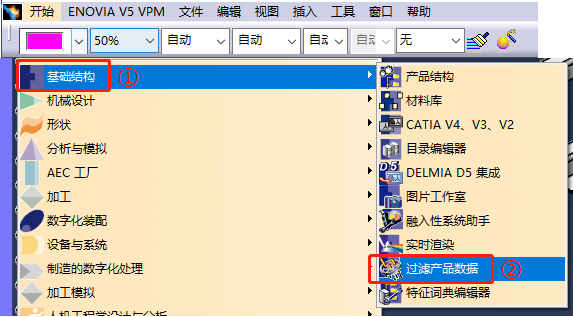 Step2:双击Product结构树激活,再点击【开始】菜单,选择【基础结构】下的【过滤产品数据】,再选择右侧工具栏的【产品至零件】。