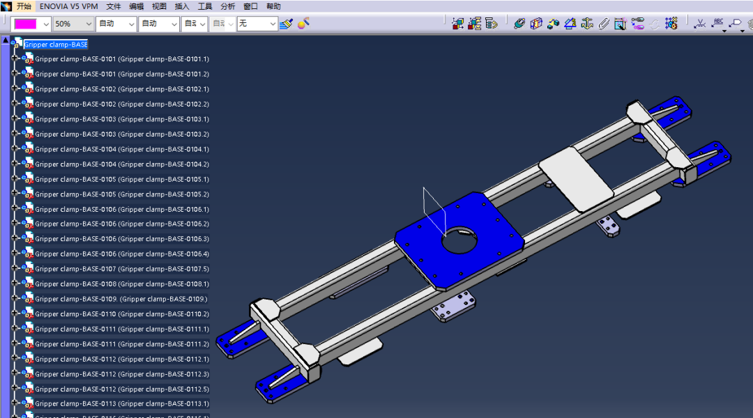 Step1:打开夹具抓手Base板,目录树内有多个Part零件组成,要转换成单个Part才可以进行受力分析。