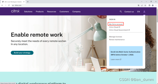 首先登录https://www.citrix.com,点击My Citrix account
