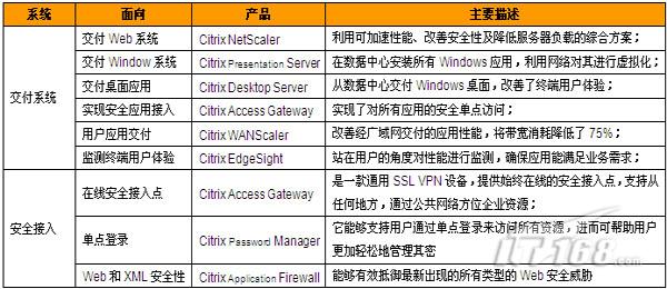 思杰产品针对特定业务难点提供解决方案,在应用和桌面虚拟化、 Web 应用优化及其 安全性、 SSL *** 网关、按需协助( on-demand assistance )、在线协作和 IP 技术市场中具有较强的优势。Citrix Delivery Center是一个较为全面的应用交付方案,可以从数据中心将应用和桌面系统安全地进行交付,任何用户可以随时、随地安全地使用这些交付的应用和桌面。(图1、2)
