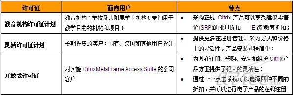 Citrix面向不同的用户,提供了三种许可证计划,我们整理如下:(图12)
