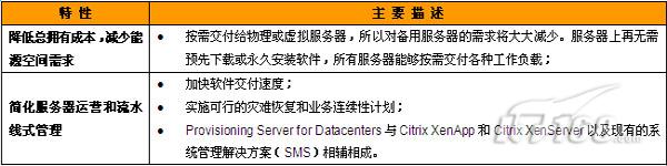 Citrix Provisioning Server for Datacenters 4.5 能够使数据中心 服务器的工作负载虚拟化,如 操作系统、应用和配置,并且根据需要,可通过 网络为物理或虚拟服务器分配工作负载,从而能够降低总体拥有成本。它可以根据需要分配服务器工作负载,而不是逐个服务器部署。因此具有以下特点: