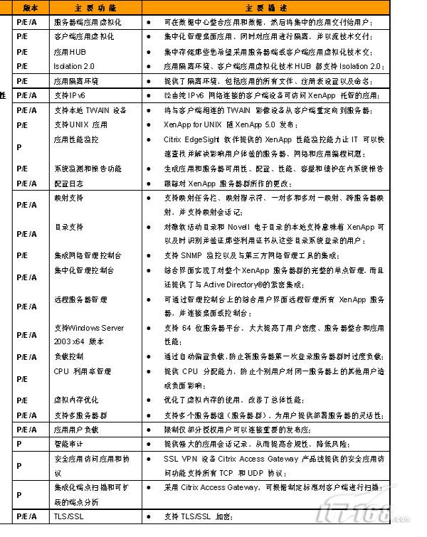 Citrix XenApp 5版本分为--铂金版(P)、企业版(E)、高级版(A),我们例举了一些主要和常见的功能,一些功能在不同的版本中会有不同的应用。(图5)
