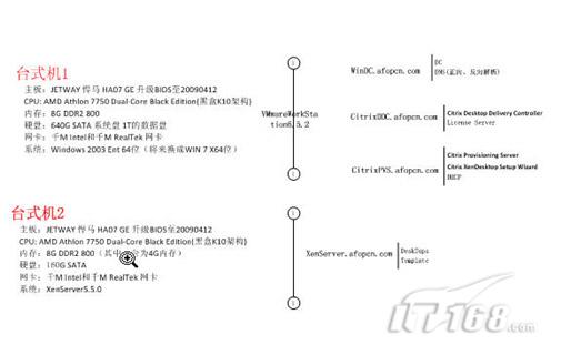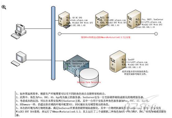 其中一台机器上安装有Windows 2003 Ent 64位OS,并在其上安装了VMware Workstation 6.5.2。在VMware Workstation上面跑了三台Windows 2003 Ent 32位的OS,分别安装了DDC/LicenseServer及PVS/DHCP/XenCenter、AD等。