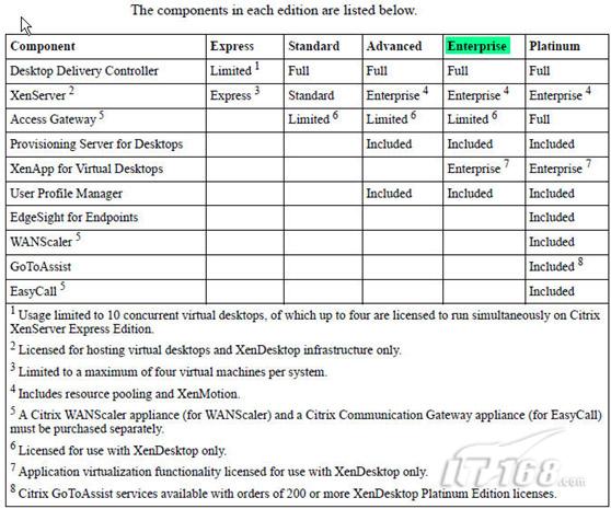上述的组件,根据XenDesktop的版本不同而有所差异,详见下面,而在此实验中,是采用的企业版(作为中小型企业,这个版本所提供的功能已足够了),通过网上得到的授权有三个月的使用期,功能并不受到限制: