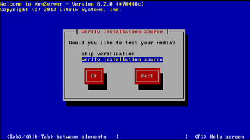 2.8进入介质检测界面,选择Skip Verification,TAB 到OK,回车,跳过安装介质检测(注:如果需要检测介质,请选择Verify installation source )