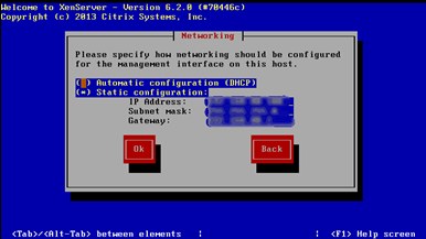 2.11进入网络信息配置界面,TAB 到Static configuration,空格选中,并输入XenServer 所对应的IP 地址192.168.80..100、子网掩码255.255.255.0、网关192.168.80.1 等信息