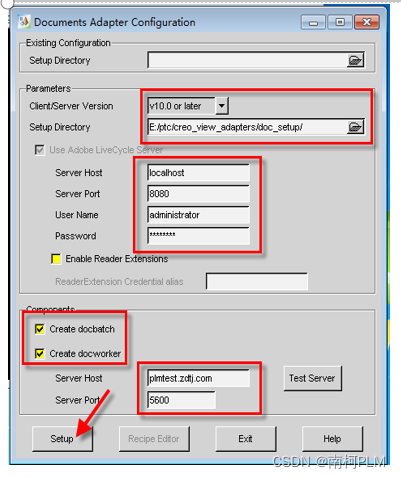 2.按图中进行配置,指定路径: E:\ptc\creo_view_adapters\doc_setup (后期配置需要) Server Host:plmtest.zdtj.com Server Port:5600