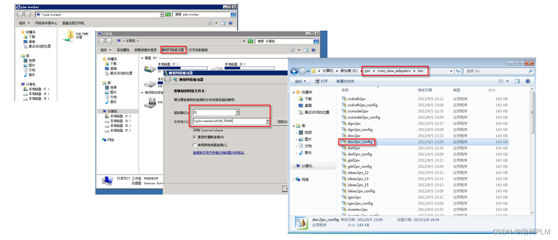 1.在worker机上共享一个目录如: E:\ptc\PLM_TEMP,在windchill服务器上访问该共享文件,并将其映射为一个网络虚拟盘如z:;运行安装目录的:\ptc\creo_view_adapters\bin\doc2pv_config.exe