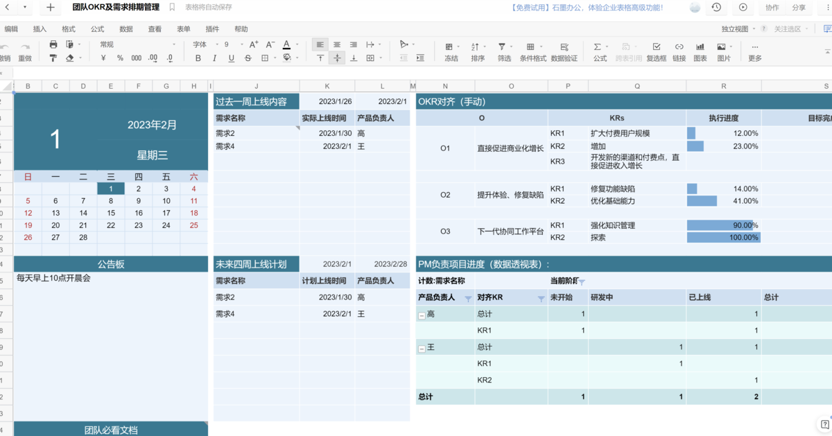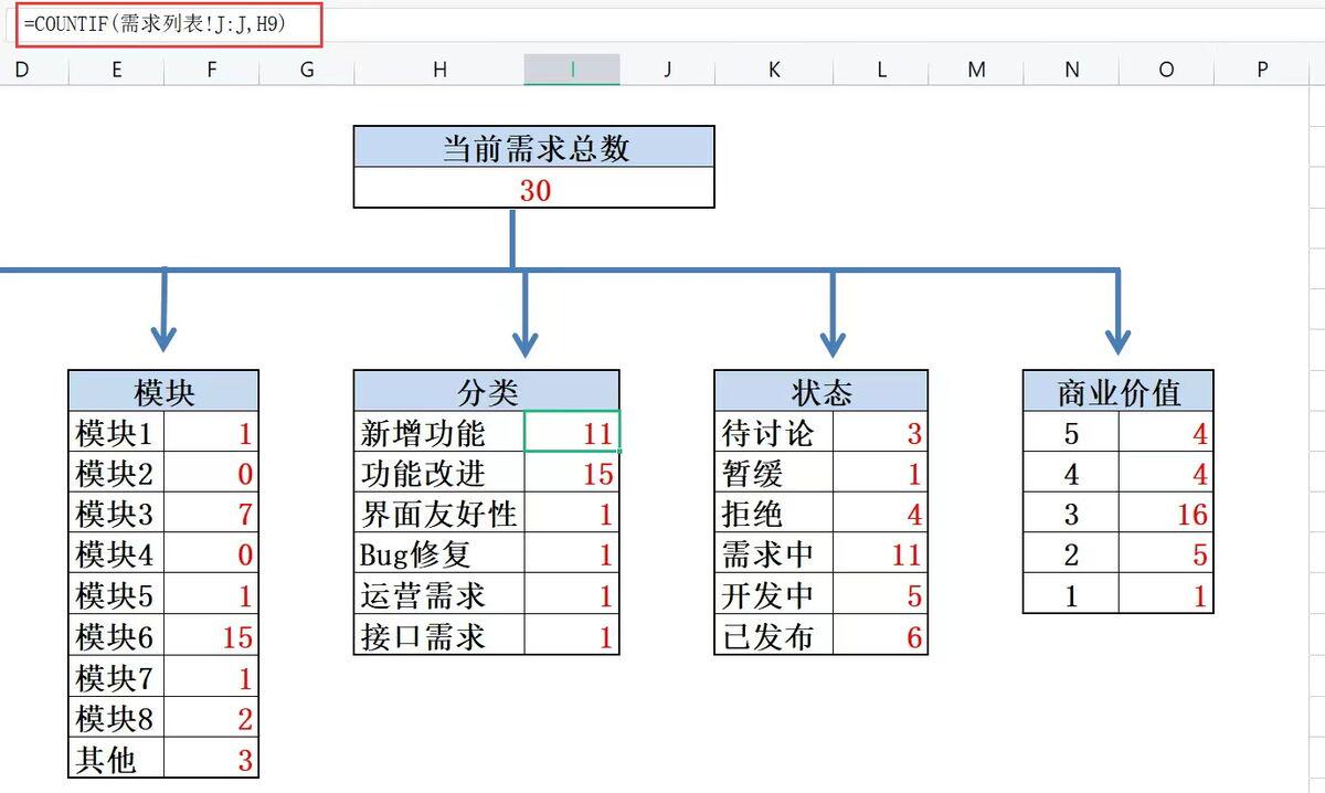 在需求管理工具中最简单方便的工具是 Excel,非常适合个人或者是几个人的小微团队进行需求管理。优点是高效便捷易用,学习成本低,并且对于需要统计的指标,也可以通过excel自带的函数进行统计: